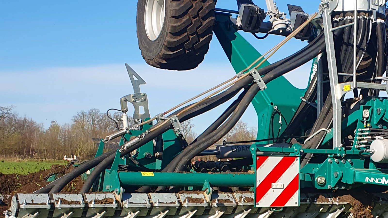 Ein speziell entwickeltes Seilsystem hebt die Verschlauchung beim Ausklappen automatisch vom Rahmen ab und bringt sie in eine sickenfreie, gespannte Position. Dadurch wird ein gleichmäßiger und störungsfreier Gülledurchfluss gewährleistet. Gleichzeitig verhindert die Konstruktion, dass sich aufgeworfener Boden an den Schläuchen festsetzen kann.