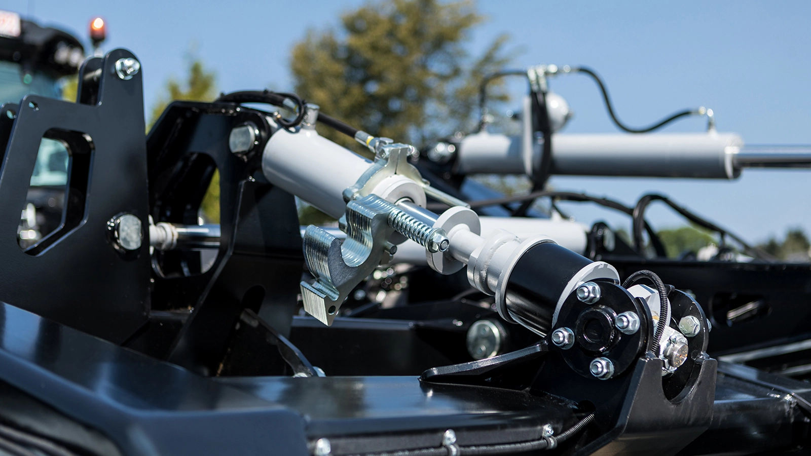 Das weit nach vorn schwenkbare Fahrwerk sorgt in Arbeitsstellung durch optimale Gewichtsverteilung für ein gleichmäßiges Arbeitsbild. In Transportstellung sorgt es für ein ruhiges Fahrverhalten.